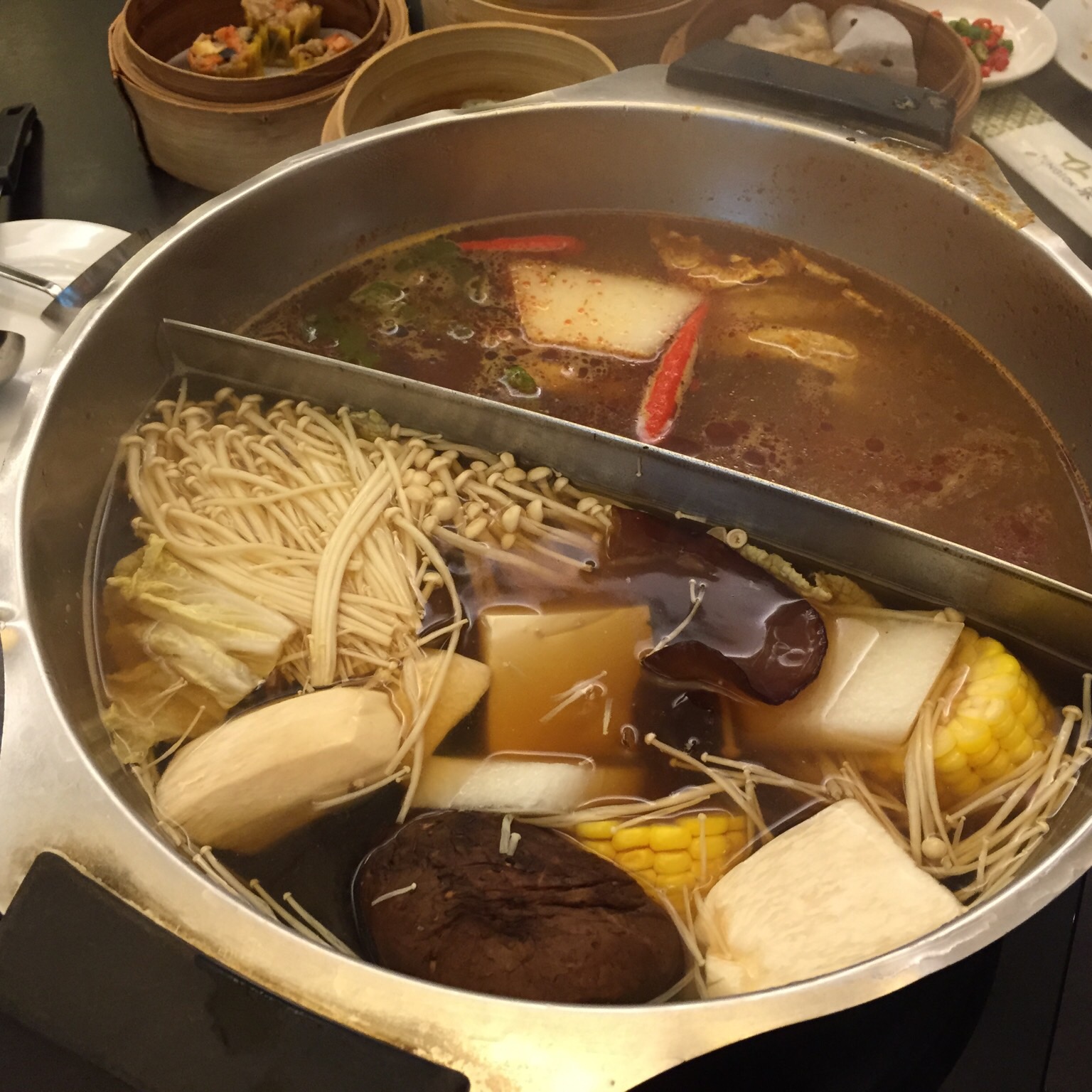 Steamboat comprising of mushroom soup and tomyam soup. The tomyam base was much better. The mushroom soup base was just a lot of mushroom soup powder.