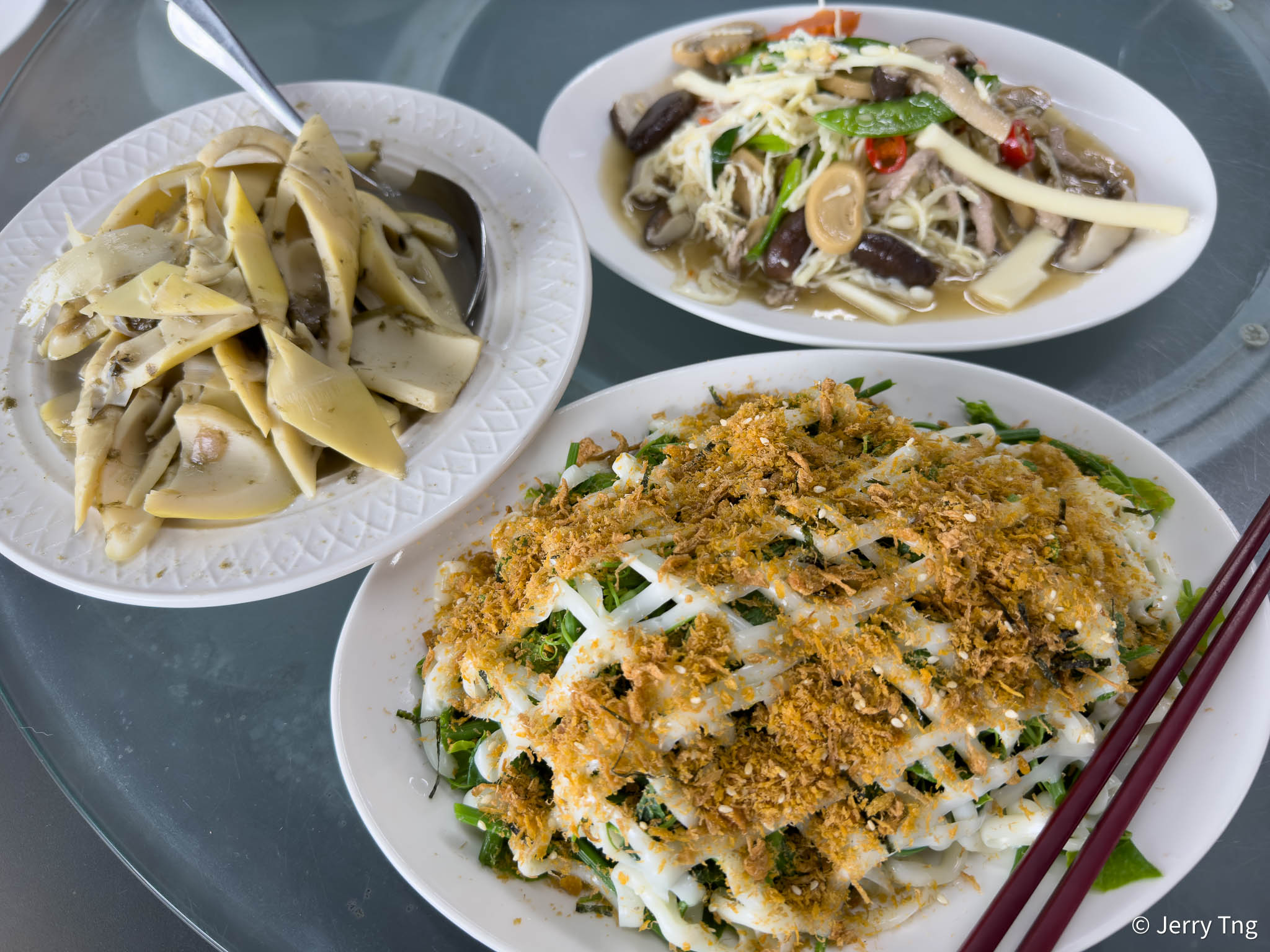 Makino bamboo shoots (桂竹筍) have a relatively short season and are particularly associated with the months following the Tomb Sweeping Festival (usually around Apr/May). Makino bamboo shoots up with the plum rains, growing up to 20cm in a single day. In their fresh state they do not keep well and so they are usually processed immediately after harvest as a preserved product. Here, the shoots were braised in a sauce most likely because they were salted to be preserved.