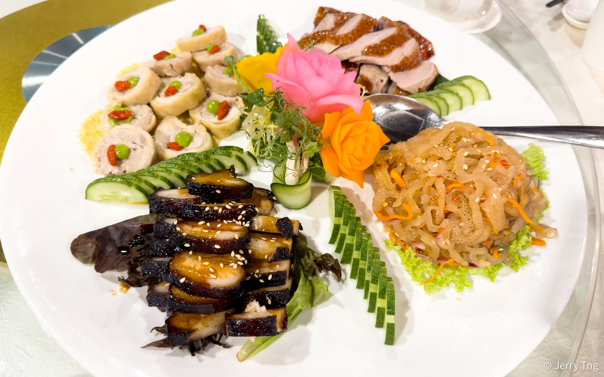 Drunken Chicken Roll, Marinated Jelly Fish, Smoked Duck, Honey-glazed Kurobuta Pork Char-Siu