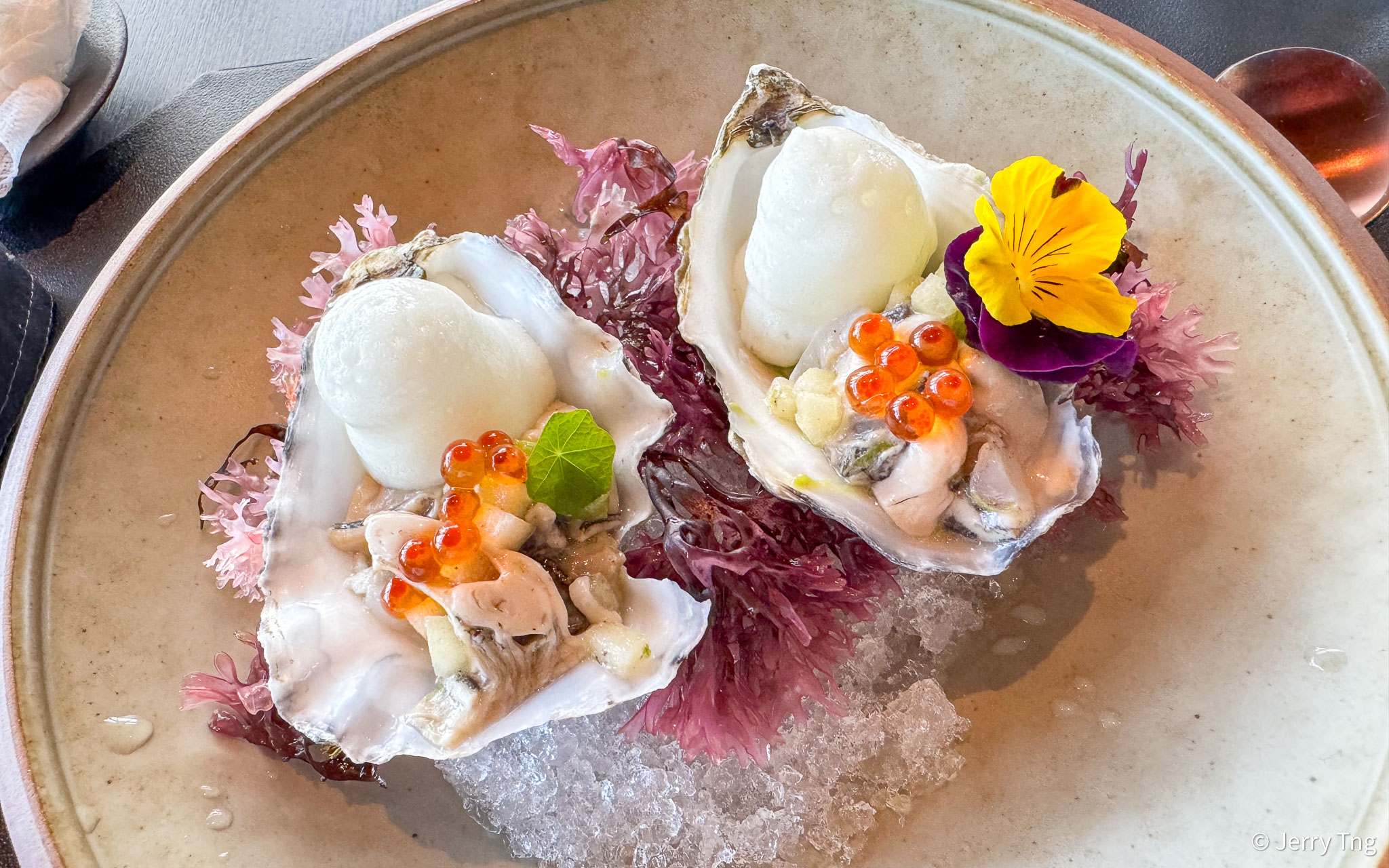 What an eye candy! We started with a freshly shucked Pacific oyster that was topped with salmon roe, nasturtium and flavoured with yuzu foam and chopped shallots. We were told the seaweed at the bottom are for decoration and not for eating 😉 Definitely the influence on this appetiser was Japanese.