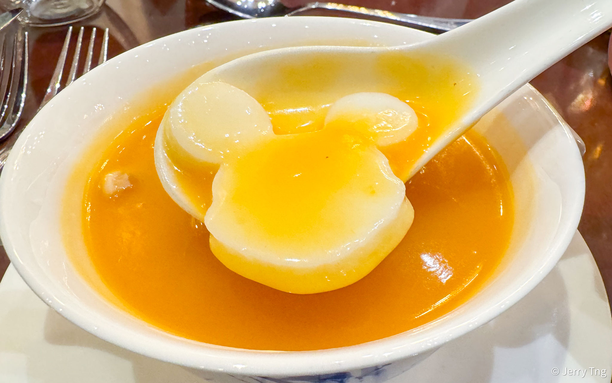 It can only be found in a Chinese Disneyland. The soup was a Chinese style chicken soup thickened with pumpkin mousse with small pieces of pig’s stomach 豬肚 and lotus seed 蓮子. The soup was surprising delicious but it was cold. And yes, there’s a piece of tofu in the shape of Mickey.