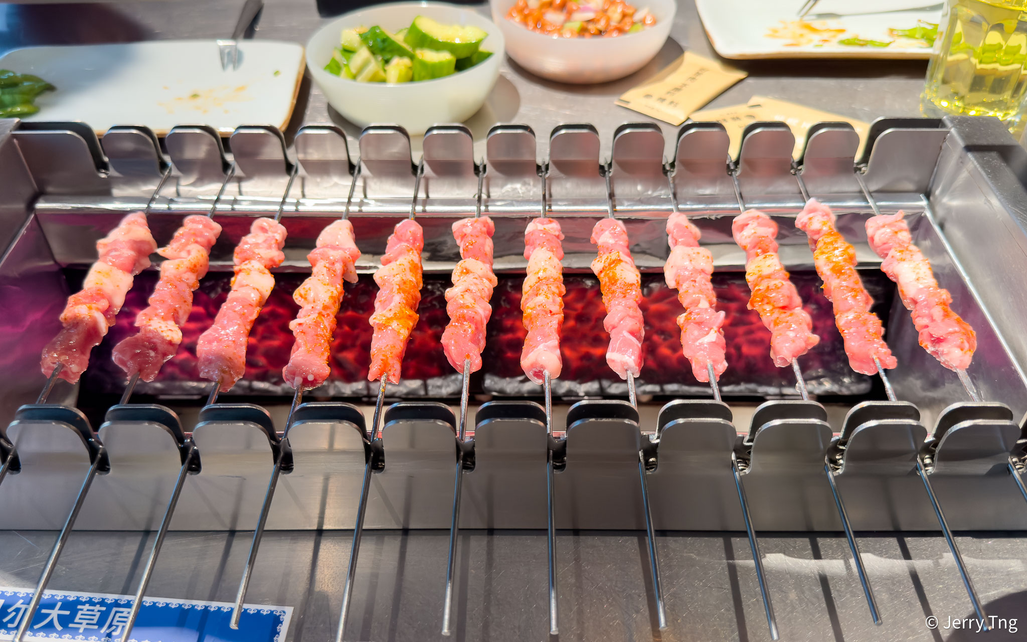 Some of the harder to cook skewers like offals are precooked in the kitchen and you just need to finish them on the griller. This gives the diners some variations in pacing, so you have something to eat while waiting for the meat to get done.