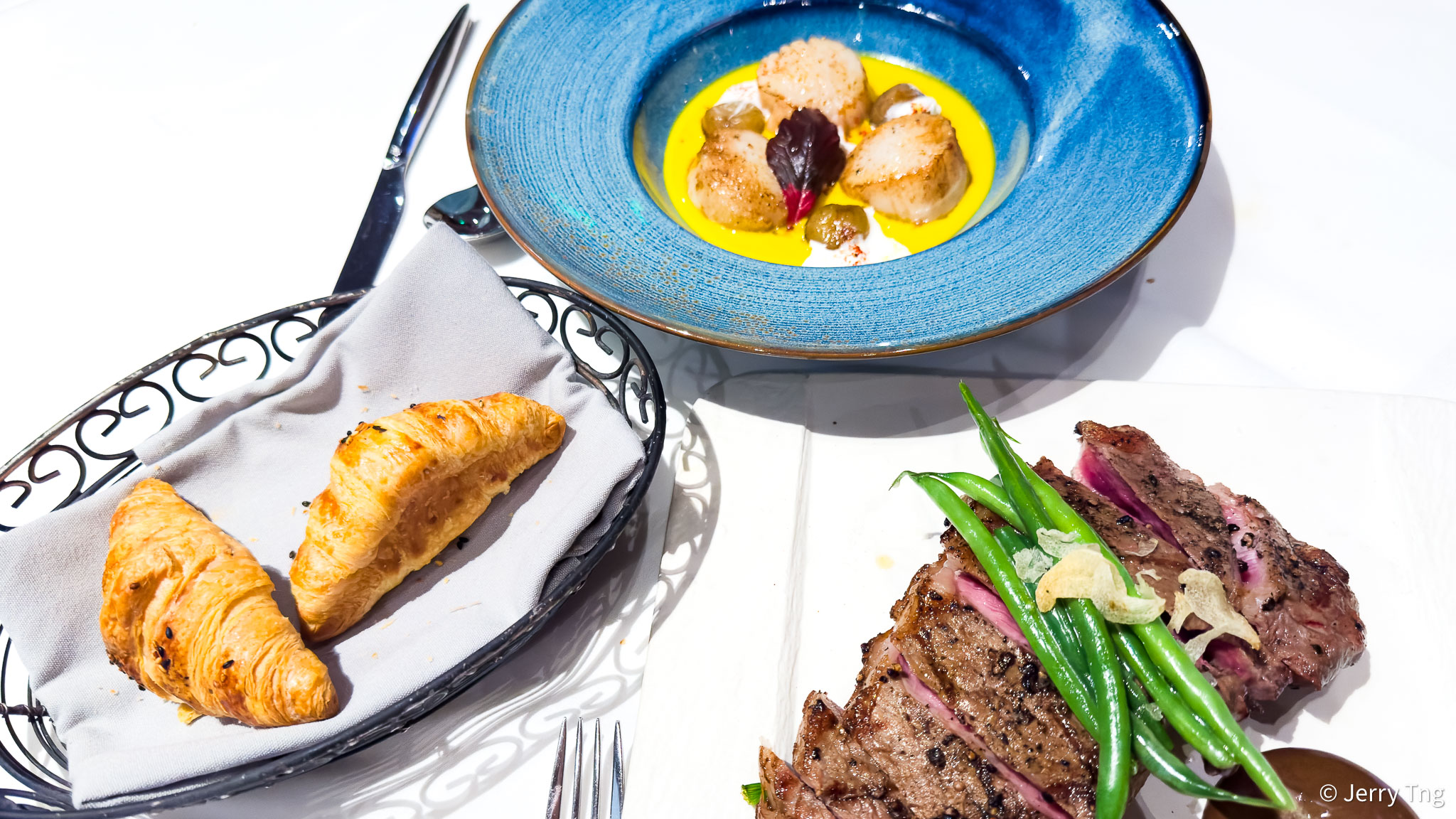 The bread service came promptly right after we placed our orders. And we were quite satisfied with the selection of warm breads on parade. The croissants were on point, buttery and flaky. Personally I loved the sesame crackers, kind of reminded me of papadum, and Darling was pinching away on the warm onion soft rolls.