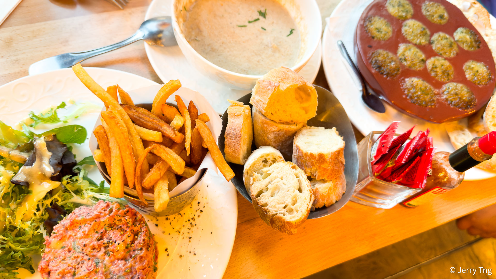 The steak is a faux-filet (lit. “fake filet”), or sirloin, pan-fried rare (“saignant“ or lit. “bloody”) with hollandaise sauce, served with deep-fried potatoes (French fries). The doneness was spot-on with a well-seared crust. McD has better fries, but they were good enough. The French will leave the fats untrimmed as they give good flavours to the steak during the searing.