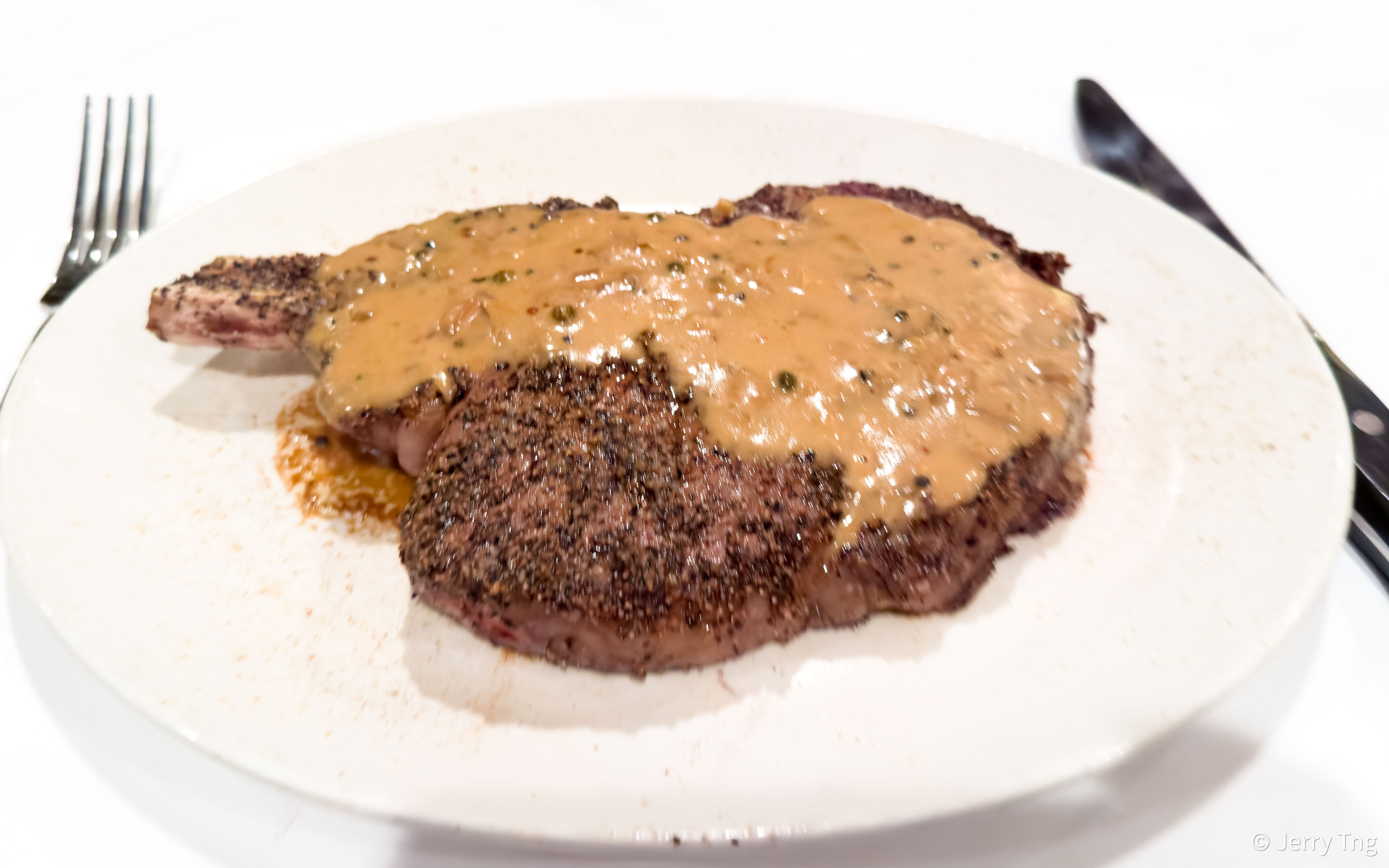 Referred to as the “Cowboy Steak”, the bone-in ribeye is a super juicy, flavourful cut of the USDA Prime beef and it is perfect for the grill. However I regretted ordering the bourbon peppercorn sauce which they poured over the steak. I had to scrape it off to one side as the meat itself was already very well salted and seasoned with burnt spice crust.