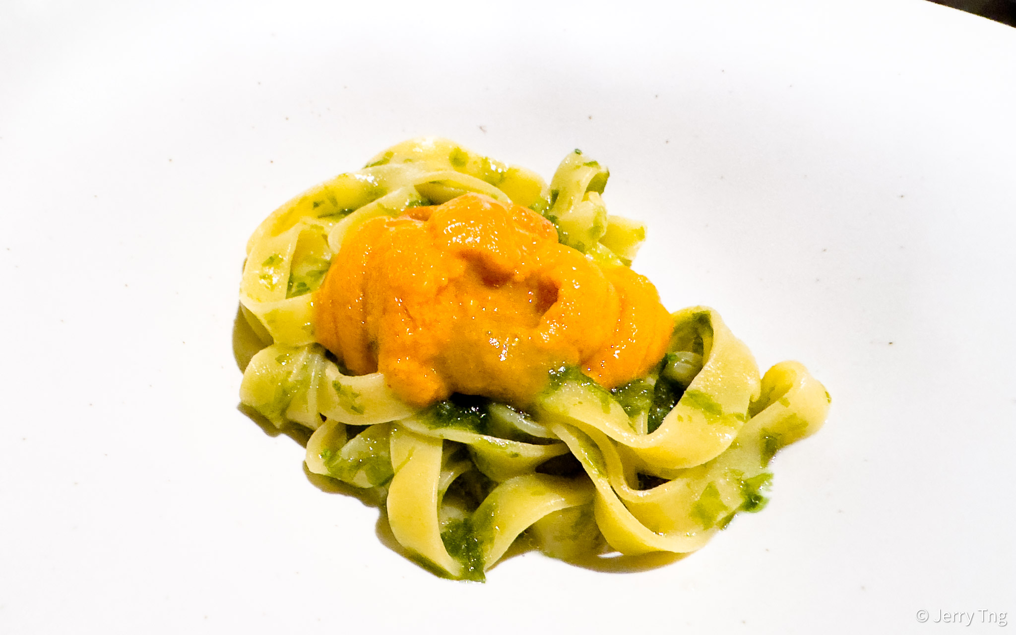 Homemade pasta with “Aonori” seaweed sauce topped with premium Hokkaido uni