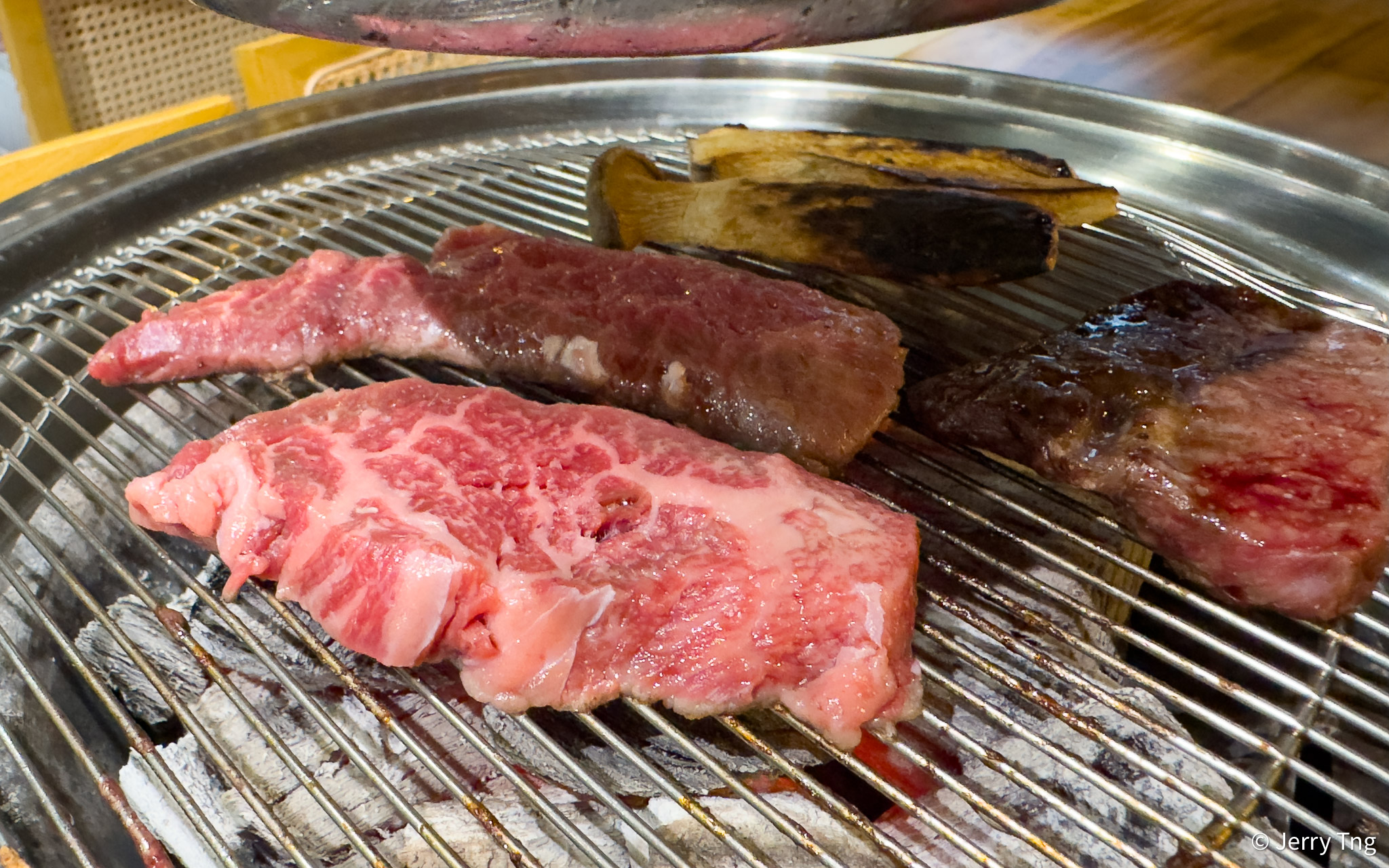 But unlike the ones in Korea, you have to do the grilling yourself. If you are not used to a table BBQ, just remember not to keep flipping the meat. The fats in the meat would grease the metal grill to make it non-stick, so don’t panic.