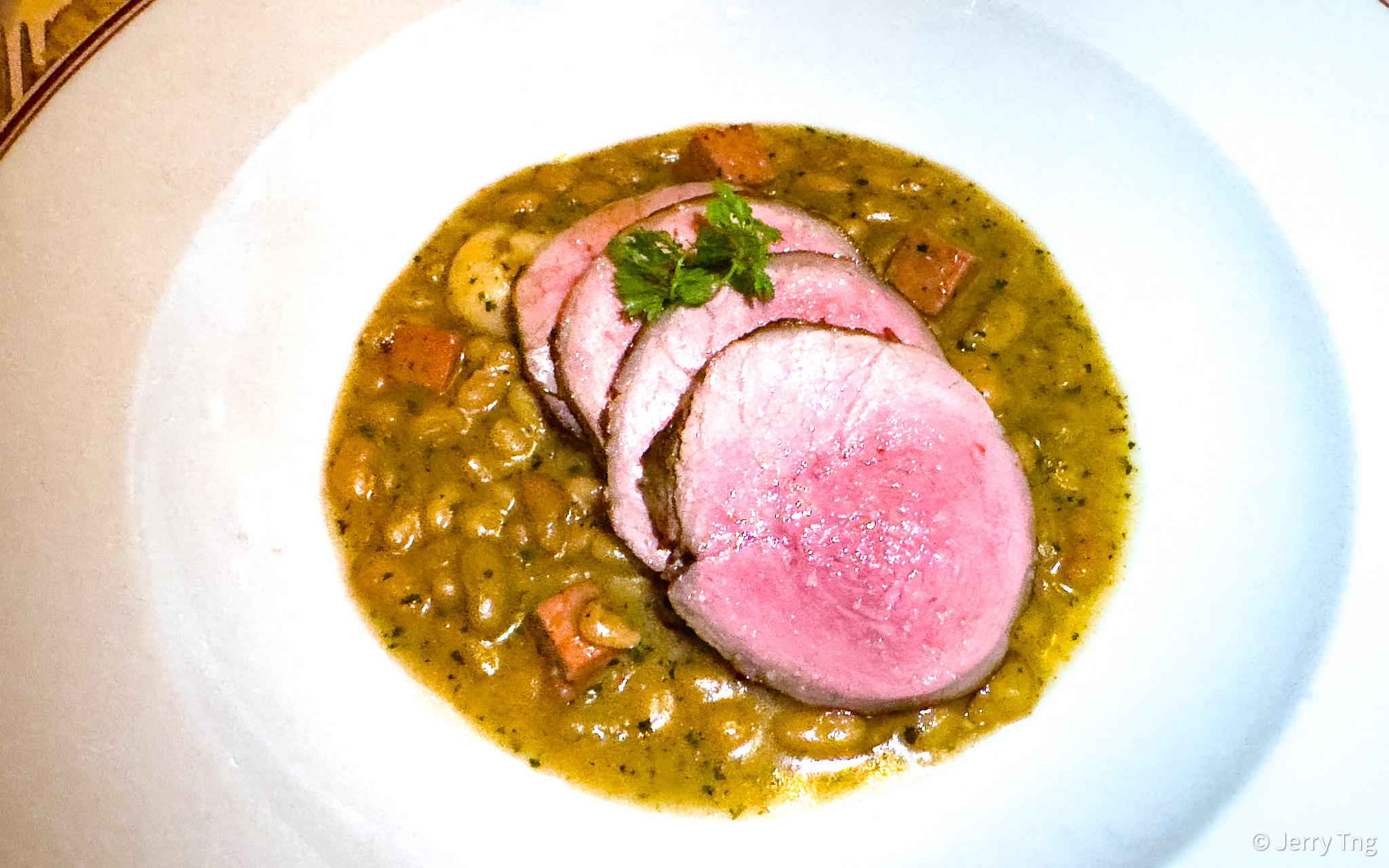 The main course was four sliced loins of roasted gigot d’agneau (leg of lamb) served in a bed of brown butter flageolet beans that had lamb jus incorporated with bits of garlic confit and bacon cubes. The lamb was so much more than I expected – it was extremely tender, fatty, juicy, and flavourful.