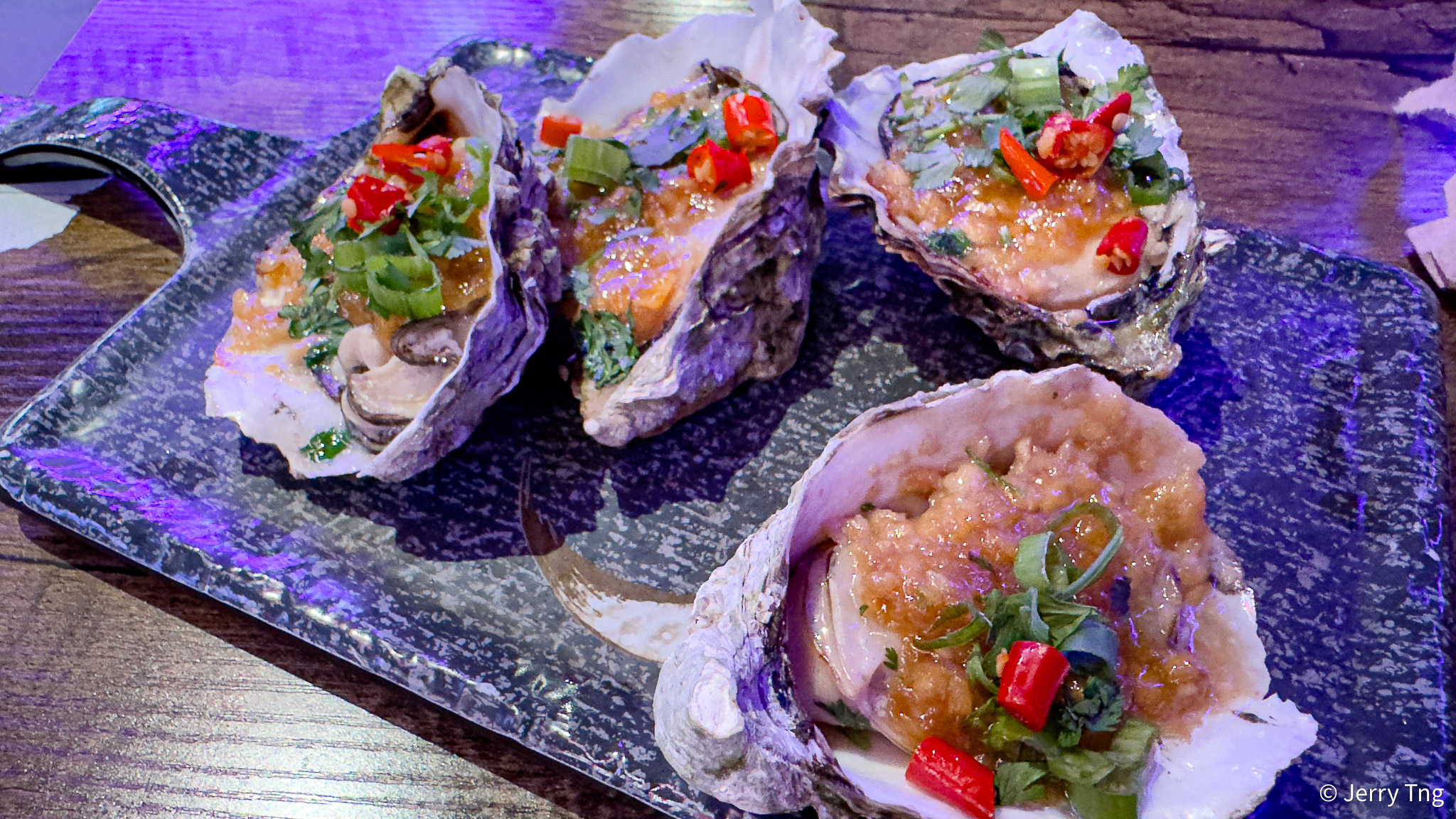 This came out very late, after our second order of grilled oysters came – but it’s well-worth the wait. Grilled eggplant topped with a savoury sauce, garnished with sliced red chilies and fresh herbs.
