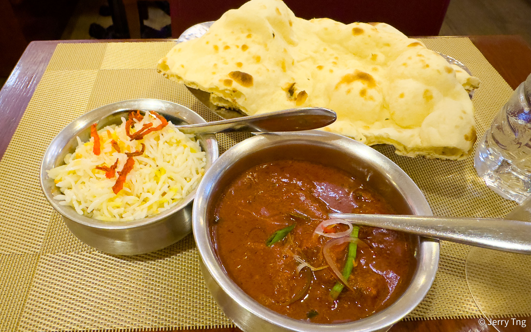 The main course came with one curry, some basmati rice and a piece of plain naan. I wasn’t sure how spicy the curry was, so I ordered a rogan josh, which is midway between devilish hot and baby hot.