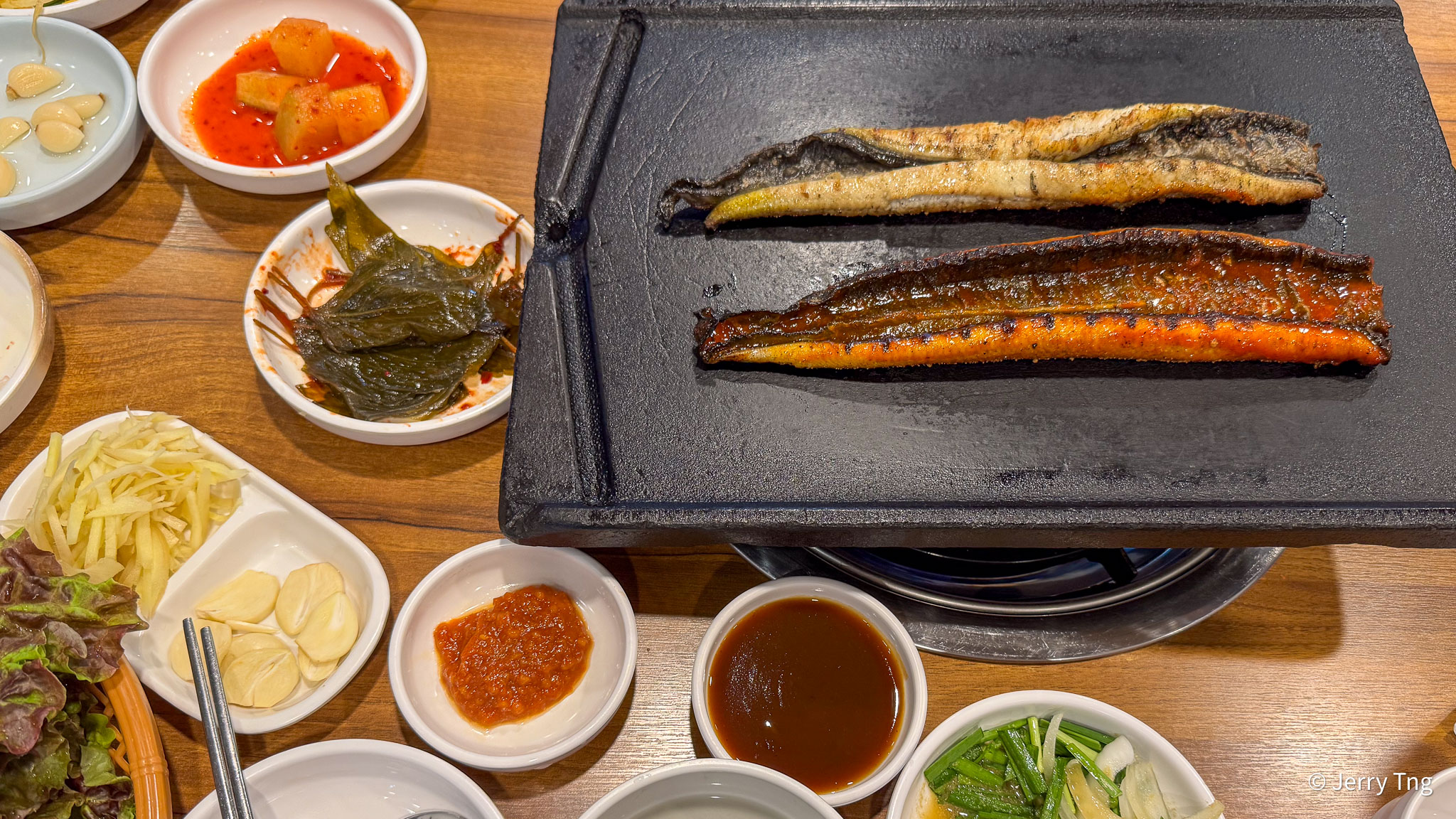 You must order at least one piece of eel per person, which costs 38,000 won per eel. And it comes in three flavours – original, spicy and sweet soy sauce. The service staff will help grill it in the kitchen and then served them on the hot plate. Then the eels are cut into slices and left on the plate to keep warm. Cold eels are horrible, just ask the English.