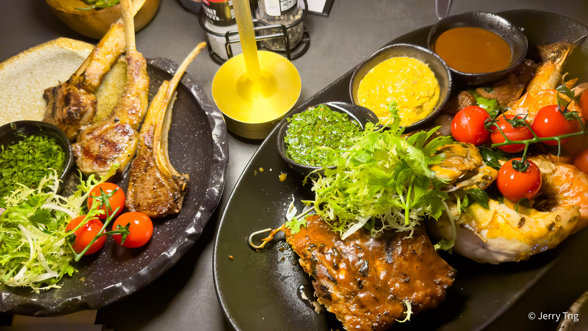 pork rib, beef tenderloin, half chicken with peri-peri sauce, jumbo tiger prawn (4 pcs), cherry tomato (sauces: bbq, black pepper sauce, chimchurri)