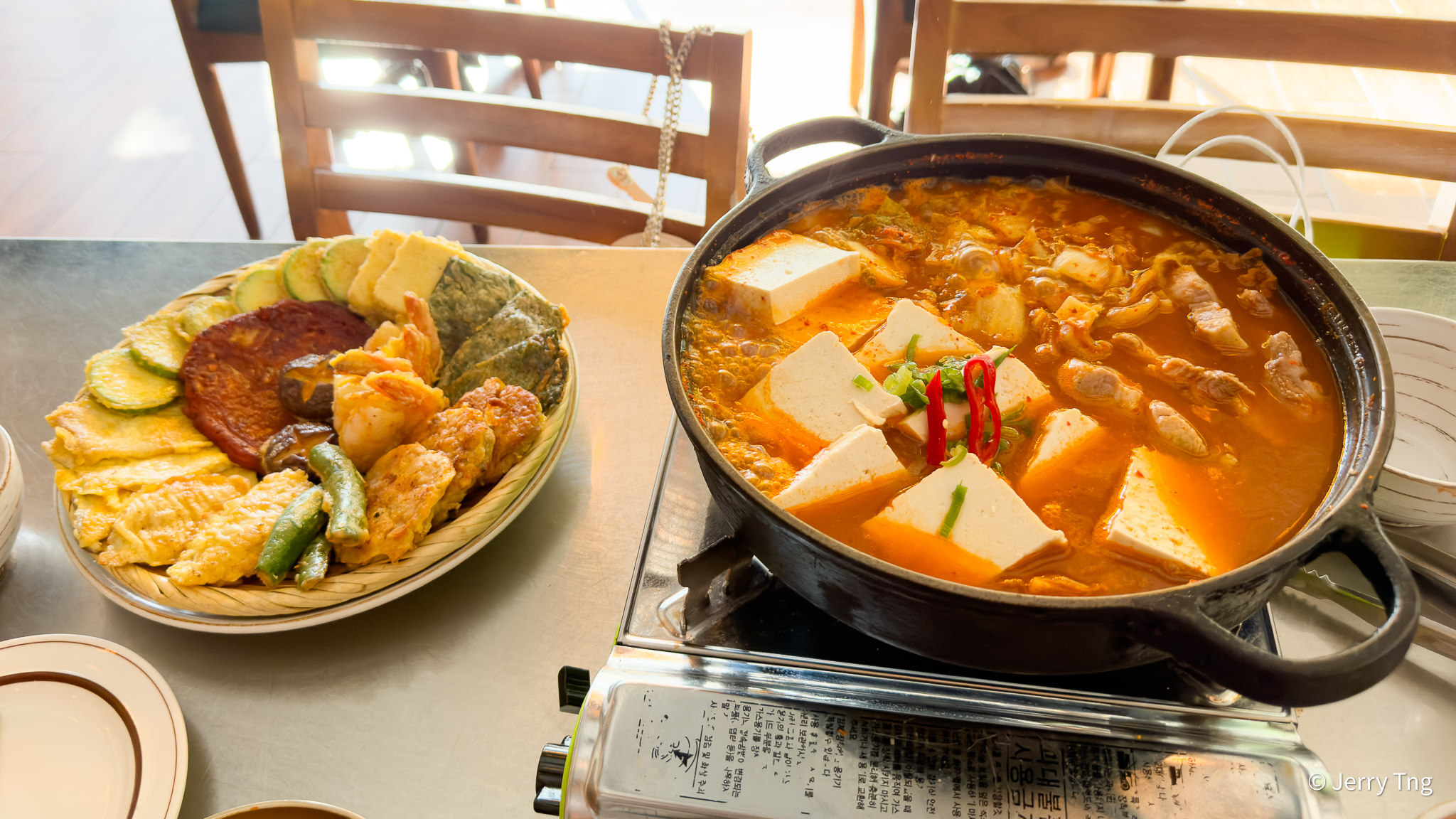 Besides the jeon, they also provide other Korean home cooked specialties like kimchi-jigae. Kimchi stew is one of the most-loved of all the stews in Korean cuisine. It’s a warm, hearty, spicy, savory, delicious dish that pretty much everyone loves. Kimchi jiggae is normally made with firm tofu, but I prefer it with soondubu (soft tofu).